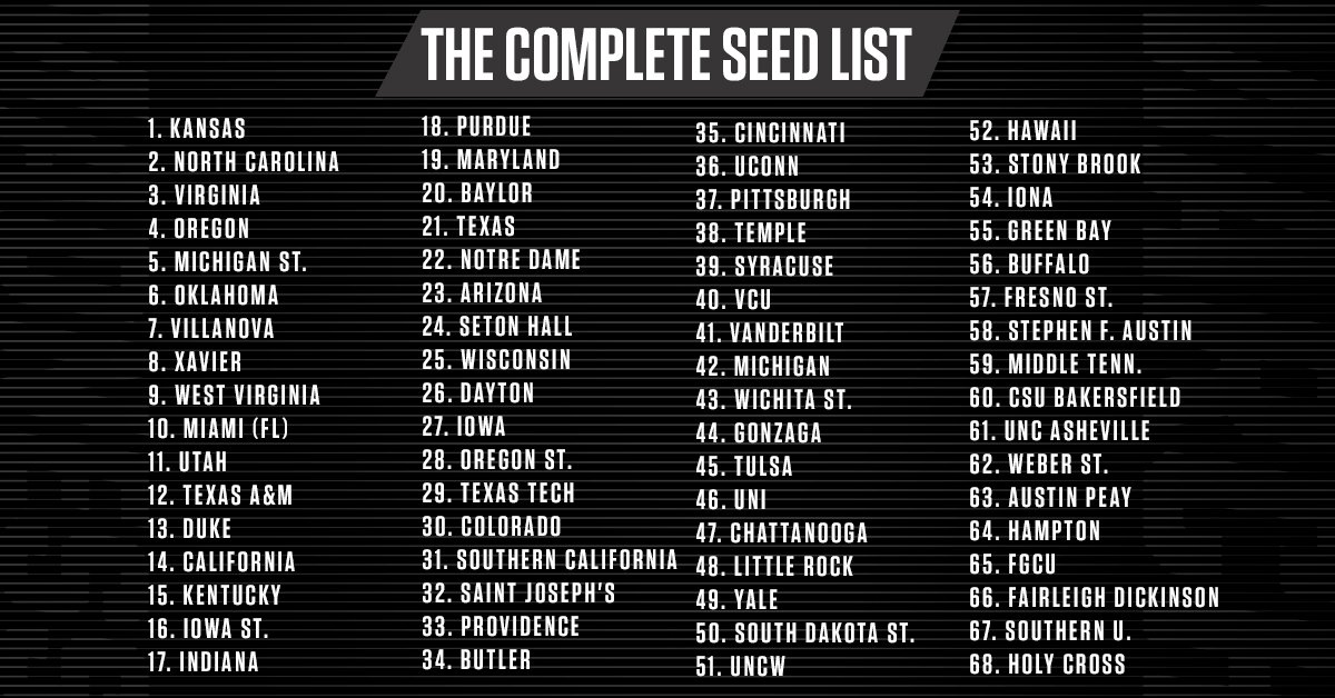 From the data we see that one-seed Kansas has the highest probability to win it all at 19 percent. Fellow one seeds UNC and Virginia follow at 15 percent and 10 percent, respectively.